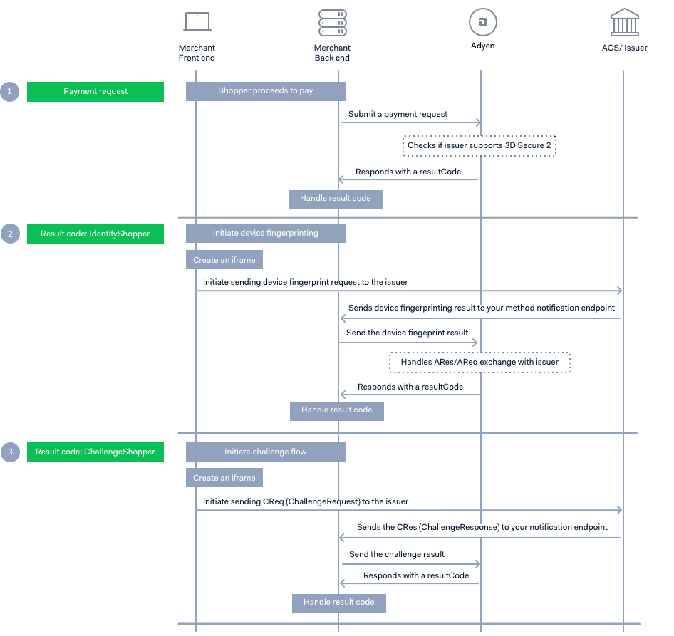 resultCodefrom the response to determine your next action. For example, to complete a 3D Secure 2 authentication flow, you might need to get the 3D Secure 2 device fingerprint, or present a challenge to the shopper, or both.