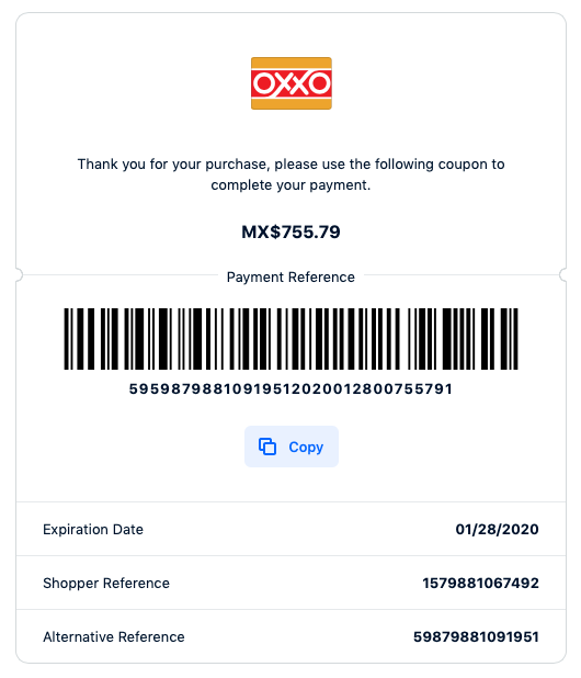 Shoppers print their voucher and present it to the cashier at an OXXO store to pay. When the payment is successful, OXXO sends a confirmation to the Adyen payments platform. This confirmation is typically received within one business day, but can take longer depending on when OXXO processes the transaction.