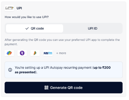 UPI Autopay enables Indian shoppers to set up recurring payments through their UPI app (for example, Google Pay, PhonePe, and Paytm).