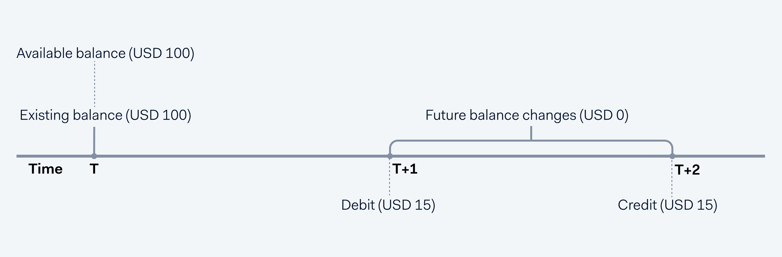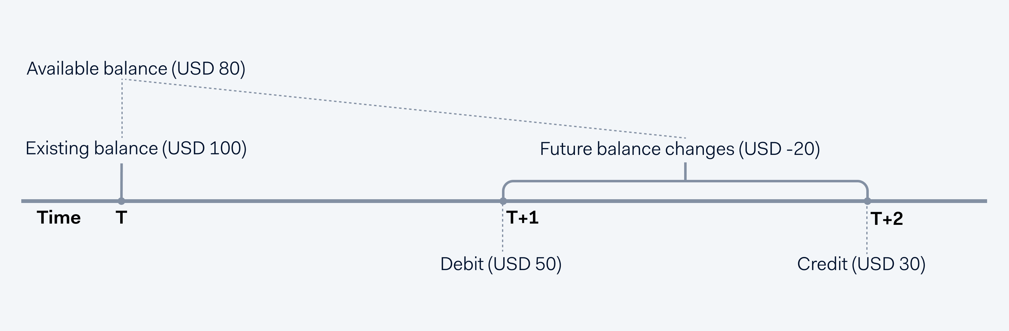 To determine the available balance, Adyen considers an existing balance and all debits and credits that are expected to occur in the future, also called future balance changes.