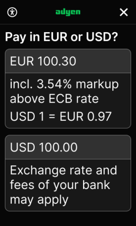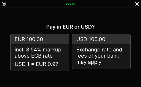 The Adyen DCC feature allows you to offer customers the choice to accept or decline DCC in a way that is fully compliant with card scheme regulations, with full disclosure of the exchange rate and markups. The customer can review DCC charges both on the payment terminal and on the Adyen-generated receipt.