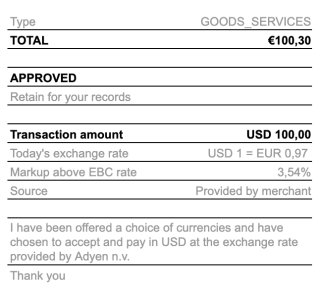 On the Adyen-generated receipt, the customer receives the same information, as well as a DCC acceptance statement (I have been offered a choice of currencies and have chosen to accept DCC and pay in {currency} at the exchange rate provided by Adyen n.v.).