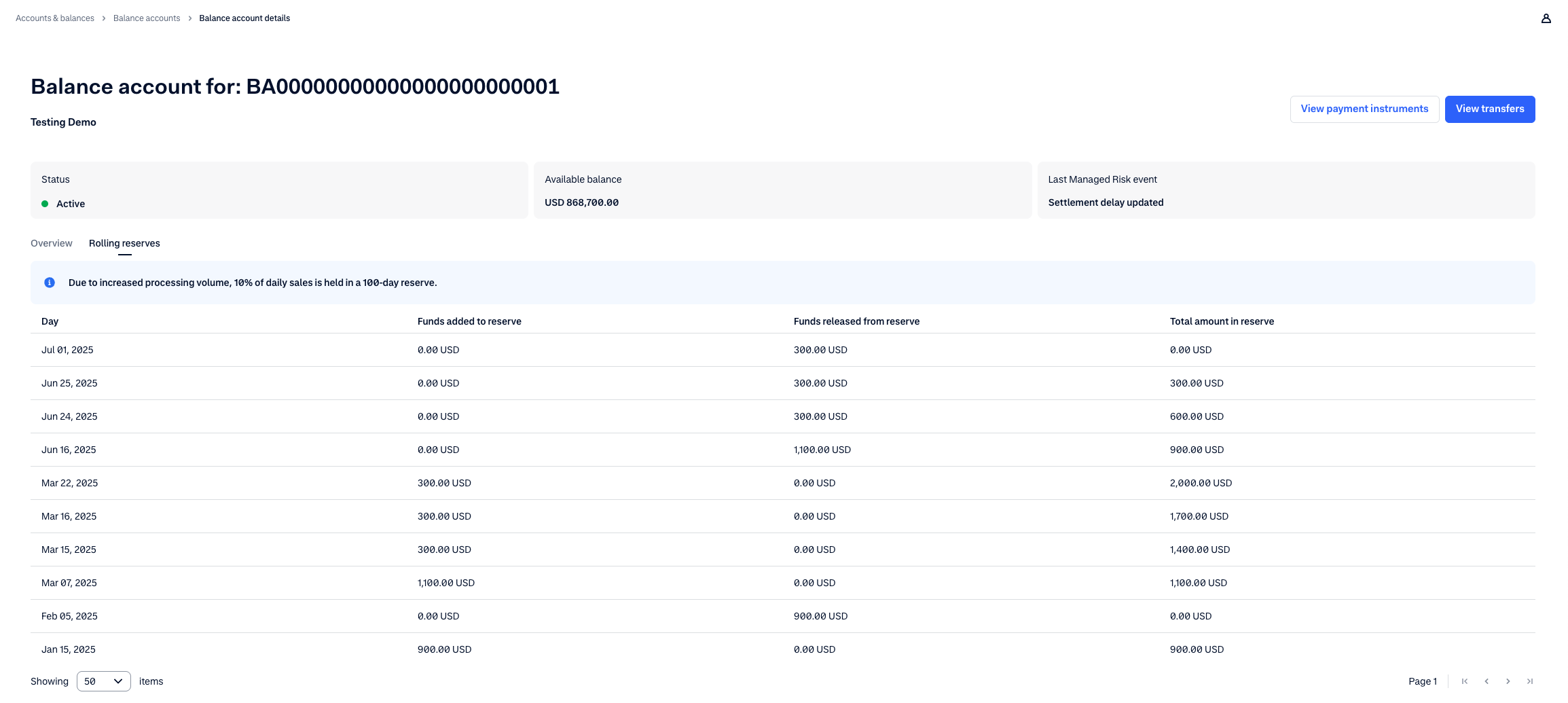 - In the table, you can see an overview of when funds are added to and released from the reserve, and the total amount that is held in reserve on your user's balance account.