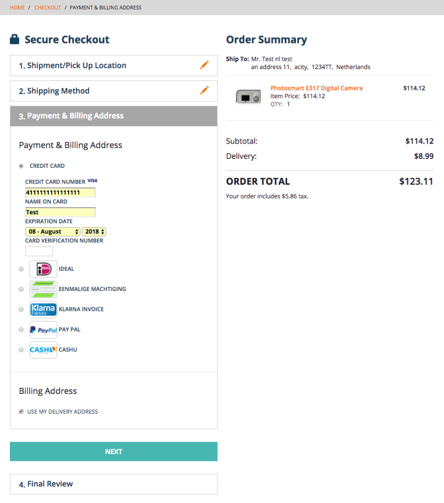 The add-on is designed to adapt the default B2C Accelerator checkout flow, and uses different flows for cards and for local payment methods.
