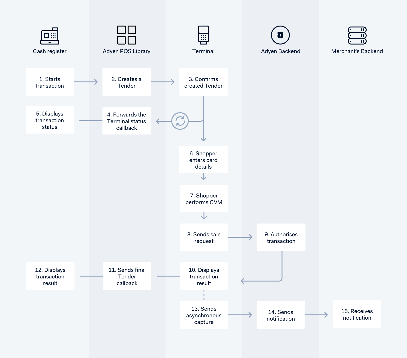 The POS library sends the final result callback to the cash register. The result can be: Approved, Declined, Cancelled or Error.