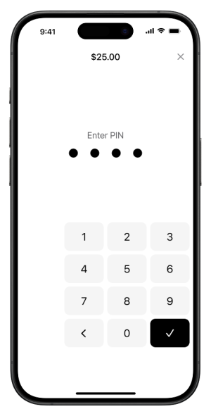 It is possible to make PIN transactions in your Tap to Pay and card reader solution. Unlike traditional payment terminals with physical keypads, PIN entry on a mobile device requires specialized security measures to protect the shopper's data. To comply with PCI MPoC compliance requirements, the PIN entry pad is not always centered on the mobile device screen. Instead, it appears in a random position as shown in the following examples.