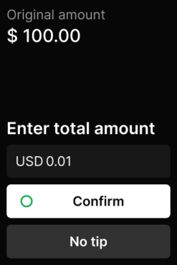 - Ask for a tip amount: the customer chooses a predefined tipping option on the display or enters a custom tip amount (or chooses to skip giving a tip).