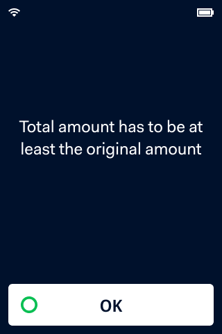 For example, you can set the warning screen threshold to 50% of the original purchase amount. If the original amount is EUR 100.00 and the customer enters a tip of EUR 50.00 or more, the terminal shows the warning screen. The customer can then confirm the amount or go back to the previous screen.