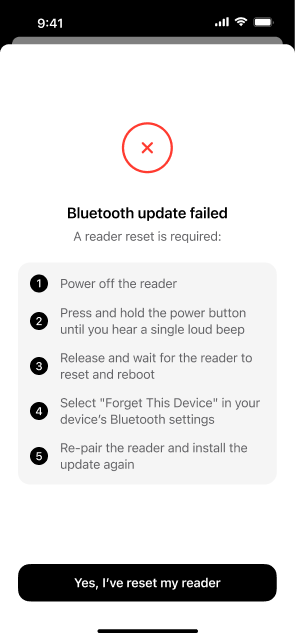 It is possible that a firmware update failed because it required a Bluetooth connection and the card reader did not have an active Bluetooth connection. When this happens, you need to reset the reader before you can try updating again. A screen appears with instructions on how to reset the reader.