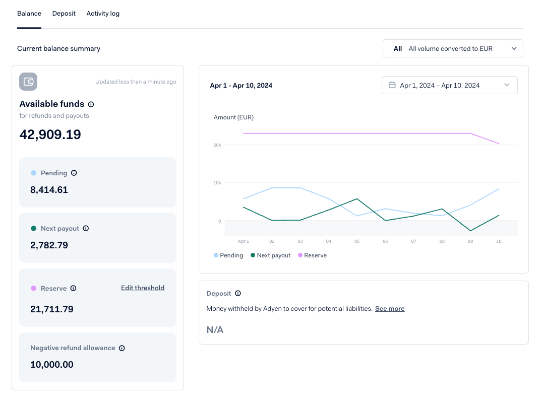The funds belonging to your business are held in your merchant account as balances. To stay updated about the balances in your accounts, you can view your balance details at the merchant account level or at the company account level (this shows the sum of the balances in all the merchant accounts). To do this, you can use the Customer Area or the Balance Control API.
