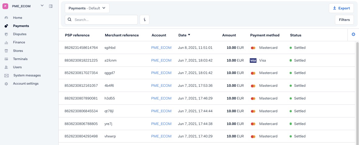 • The Filters menu in the upper-right corner. You can filter payments by date, status (for example Settled or Refused), amount, shopper interaction (Ecommerce or In-person payments), payment method, and store.