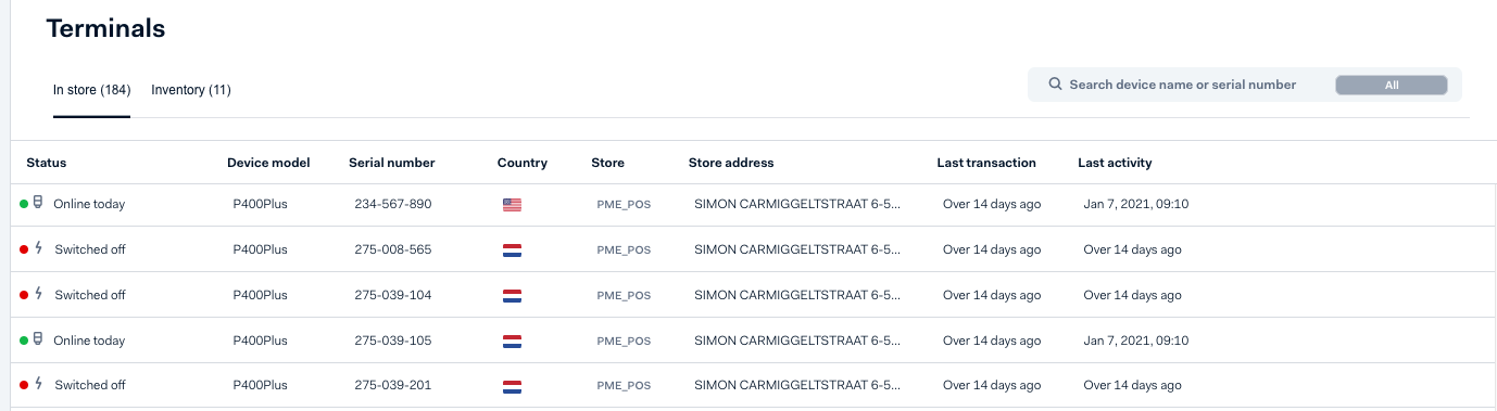If you are using payment terminals, the Terminals section of Essentials contains an overview of all terminals, including: