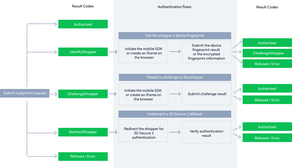 Handle the transaction based on the result code. For example, if you received an IdentifyShopper result code, proceed to get the 3D Secure device fingerprint and then submit the required data to Adyen. The possible responses after you submit the device fingerprint results are: