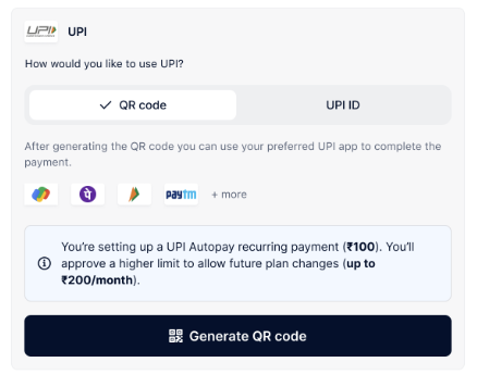 UPI Autopay enables Indian shoppers to set up recurring payments through their UPI app (for example, Google Pay, PhonePe, and Paytm).