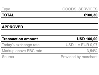 SaleToAcquirerDatafield of the PaymentRequest object.For example, your user sells goods worth USD 620.00 to a customer, who wants to pay in their home currency of EUR.