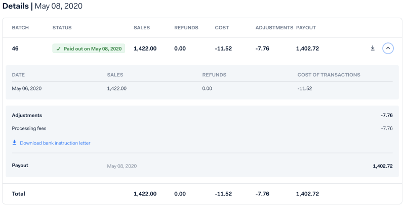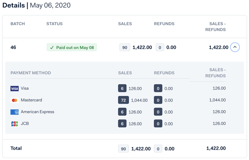When you expand the details of a batch, you can see a breakdown of sales and refunds amounts from each payment method.