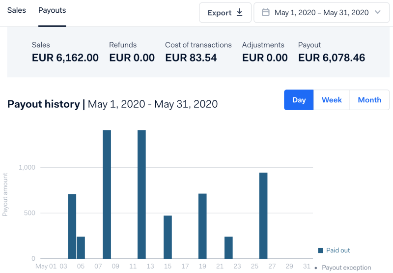 Below the summary is a chart that shows payouts. You can choose the increment of time represented by selecting Day, Week, or Month.
