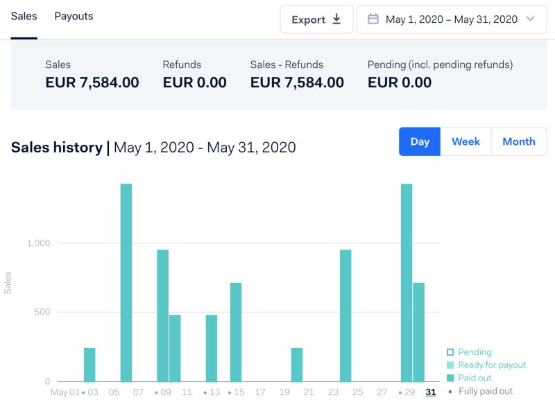 Each bar on the chart, depending on its color, indicates the amount that is Pending, Ready for payout, or Paid out. The key in the bottom right corner of the chart shows the colors and their corresponding statuses.
