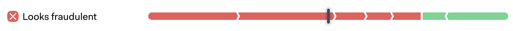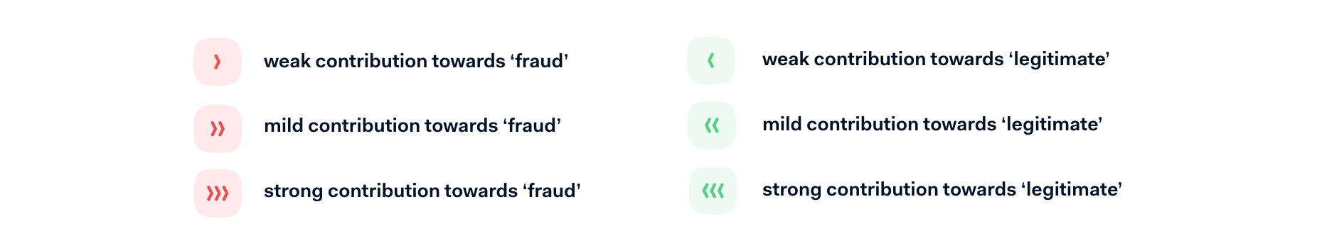 The signal bar indicates the deductive reasoning behind the model's decision for a given payment. Any payment will have positive and negative characteristics: the former moves the decision towards a 'fraud' classification, while the latter pushes the model's reasoning toward a 'legitimate' classification.